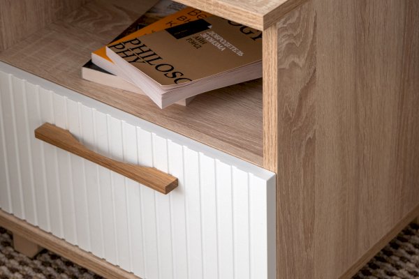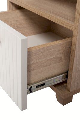 Данная модель тумбы оснащена открытой нишей и выдвижным ящиком. Ящик оборудован шариковыми направляющими полного выдвижения. Удобство использования дополняет деревянная ручка из массива дуба.