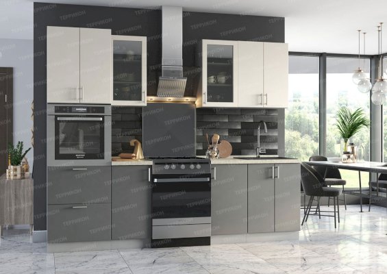 Глубина верхних шкафов указана без учета фасада, высота столов указана без учета столешницы