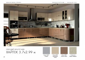 Специально для поклонников ультрасовременных интерьеров создан кухонный гарнитур «Хайтек». Мебель наделена всеми характеристиками этого стиля: стремительными линиями, монохромными цветами, глянцевыми поверхностями, минималисткой фурнитурой. Декоративные элементы не используются. Благодаря этим особенностям дизайна комплект не загромождает пространство.