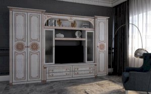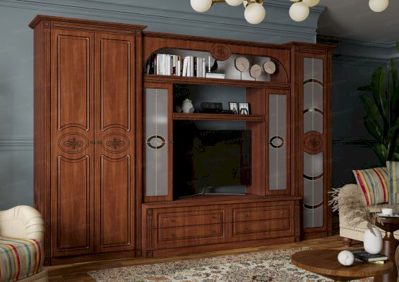 Гостиная «Джулия» — эталон хорошего вкуса и подтверждение материального благополучия владельцев жилья. Благородные оттенки натуральной древесины олицетворяют надежность и стабильность. Элегантный декор производит приятное впечатление. Замкнутые в овалы орнаменты создают иллюзию антикварности. Выразительность и оригинальность придают модели вставки из матового стекла, а также отделка шкафов и ящиков под резьбу.