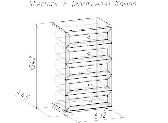 Высокий комод в спальню или в гостиную с пятью ящиками на шариковых направляющих позволит рационально использовать площадь комнаты. Повесьте над ним Зеркало Sherlock 7 или установите Трюмо с ящиками Sherlock 55 - и эргономичный вариант туалетного столика готов. Ящики глубиной 35 см, высотой 14 см, шириной 54 см выдерживают нагрузку до 20 кг каждый.