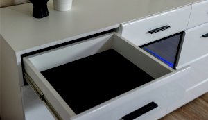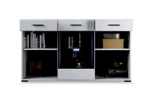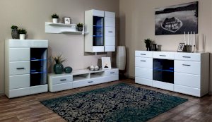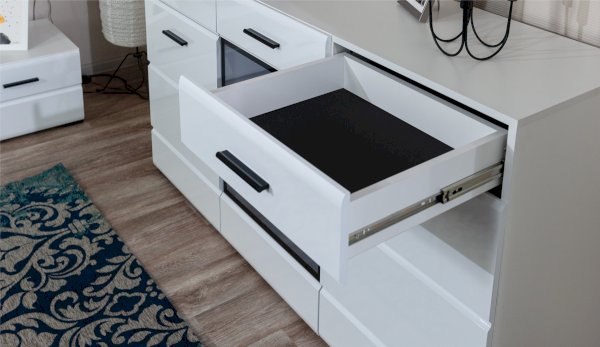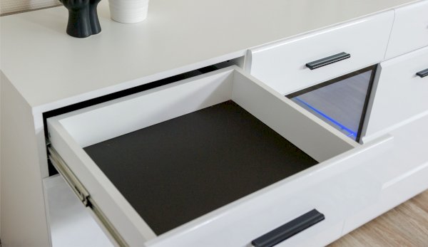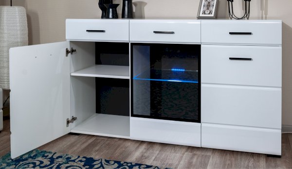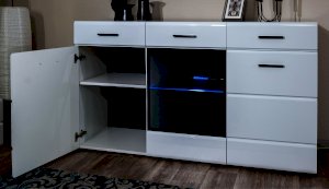 Белые глянцевые фасады МДФ и витрина с прозрачным стеклом сделают Вашу гостиную светлее и уютнее. Задняя стенка комода Йорк черного цвета красиво контрастирует с фасадами и корпусом белого цвета. Светодиодная подсветка сделает акцент на дорогих для Вас вещах, таких как фото, статуэтки или посуда. Комод оснащен всем необходимым для удобства использования, выдвижными ящиками на телескопических направляющих и закрытыми полками. Выполнен из экологически безопасных материалов.