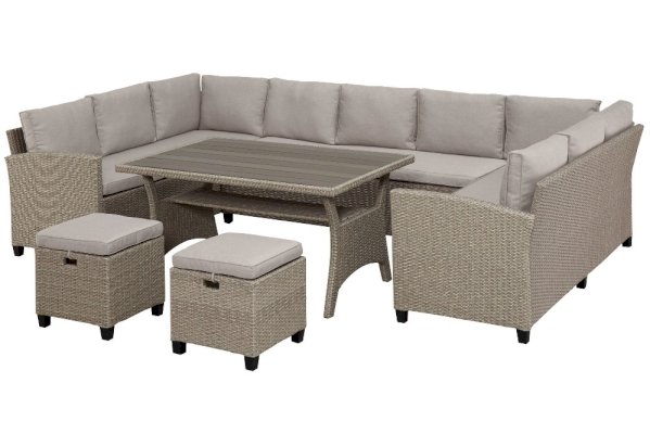 В составе комплекта: 3 дивана, стол и 2 пуфа. Высококачественная лоза из полиротанга стойкая к любым атмосферным явлениям. Крепкий стальной каркас с полимерным антивандальным покрытием и отличным качеством сварки. Изделие сплетено вручную нашими мастерами под жестким контролем качества на каждом этапе производства. Лоза максимально приближена по рельефу и текстуре к естественному материалу. Идеально подходит для использования на улице и внутри помещения в любую погоду. Не боится воды, солнца и минусовой температуры. Диваны можно скрепить между собой скобами или раздвинуть друг от друга.